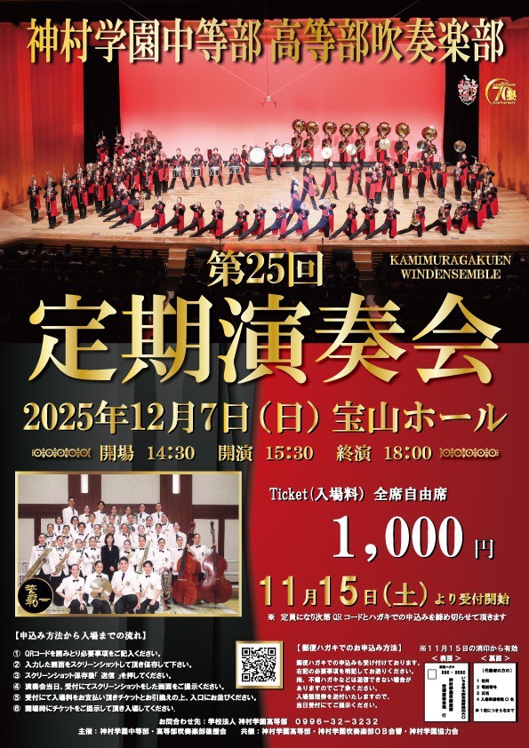 12月7日(日) 宝山ホールにおいて、神村学園中等部・高等部吹奏楽部第25回定期演奏会を開催します。